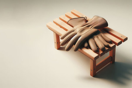 A pair of gloves on a wooden bench. Space for text