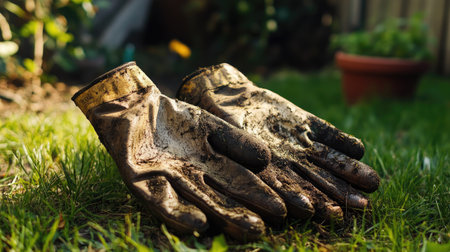 Gloves stained with grass and dirt, lying on a lawn mower in a sunny backyard