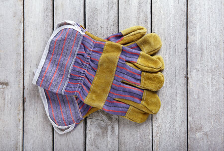 Top view of a leather work glove lying on a wooden plate