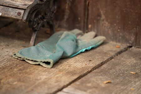 Garden gloves and gardening tools on old kitchen table