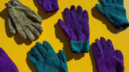 A vibrant display of colorful garden gloves arranged on a bright yellow surface, showcasing unique patterns and textures suitable for outdoor work and gardening.