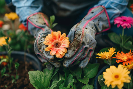 In a lush garden, a gardener's hands gently hold a vibrant Gerbera daisy, surrounded by colorful blooms, highlighting the beauty of springtime gardening.