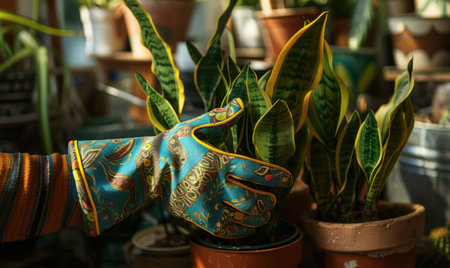 A vibrant hand wearing colorful gardening gloves gently tends to potted snake plants in a warm, sunlit environment