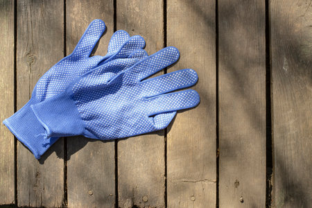Blue work gloves on old boards, top view