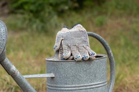 Pile of gardening gloves on wheelbarrow. Gardening concept.