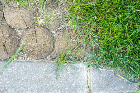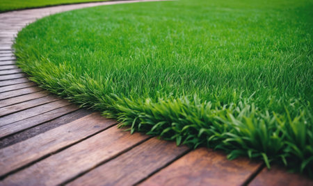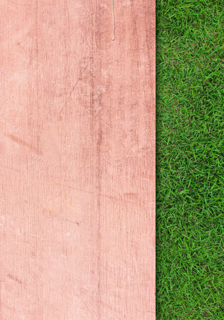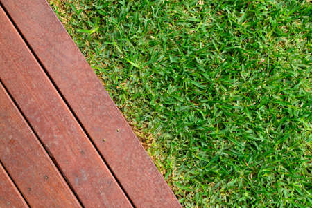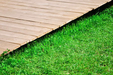 Wooden sidewalk and green lawn for background or texture - nature concept.