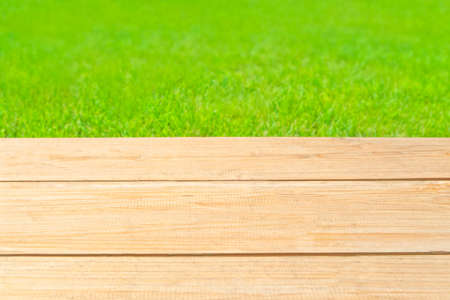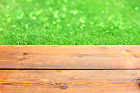 background with wooden planks at foreground and blurred green grass at background on sunny summer day