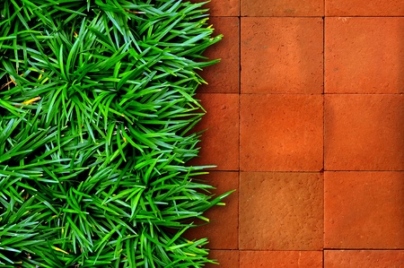 Fresh green grass on red brick background