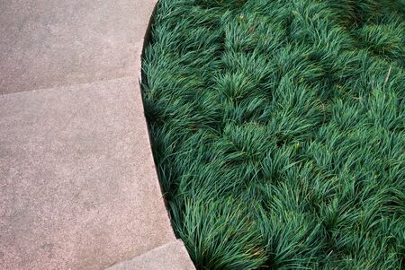 A captivating view of fresh green grass meeting a clean concrete pathway, highlighting the harmony between nature and urban design in a tranquil outdoor setting.