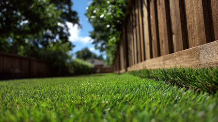 A vibrant green lawn stretches across a tranquil backyard, framed by a wooden fence and lush trees, inviting peaceful moments under a sunny sky.