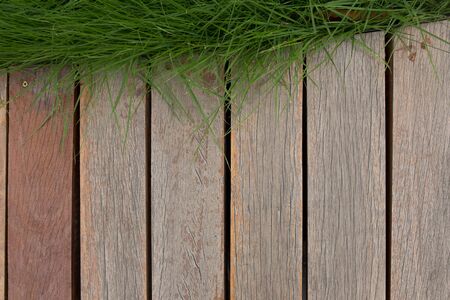 Beautiful green grass on old wooden board textile