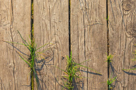 Flooring of old natural wood planks as a background, green grass grows through the planks.