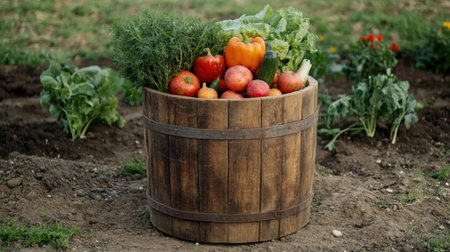 A wooden bucket overflows with freshly harvested vegetables, surrounded by lush greenery in a rural garden setting.