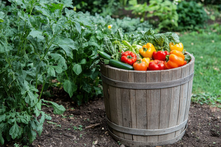 Freshly harvested vegetables, including bell peppers and leafy greens, fill a wooden bucket in a lovely rural garden.