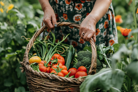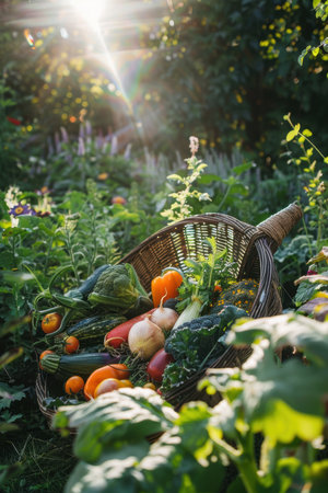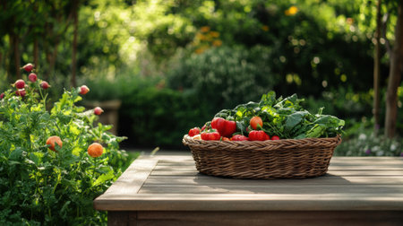 Wicker basket filled with fresh vegetables sits on a wooden table in a lush garden, showing the beauty of nature and harvesting.