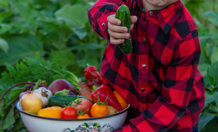 A child holds a harvest of vegetables in his hands. selective focus. nature.