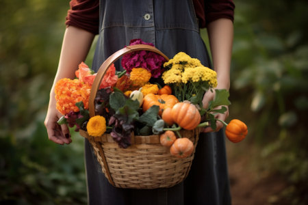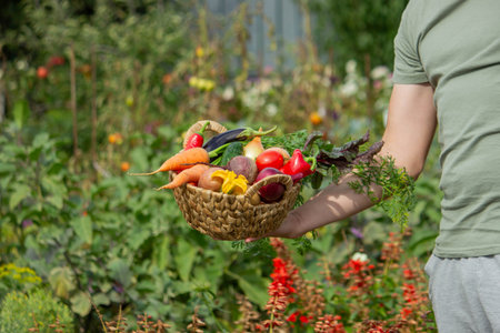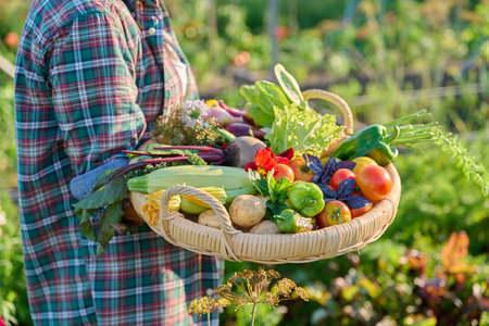 Basket with harvest of fresh vegetables herbs edible flowers in hands of female in garden