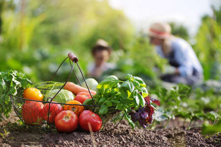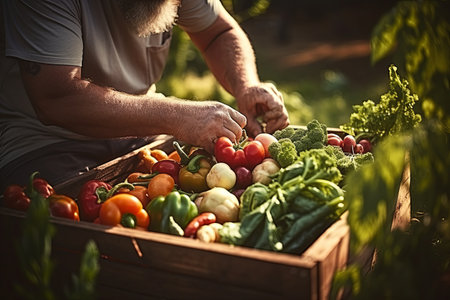Farmer in field holding basket of healthy organic vegetables or carrying a crate of freshly harvested vegetables in the garden