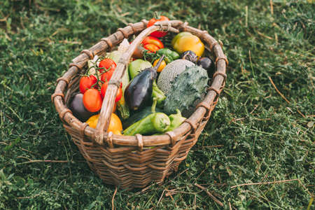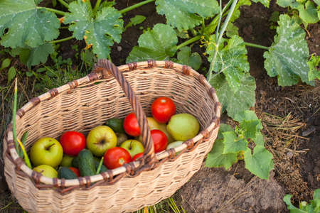 A wicker basket close-up with zucchini, eggplant, cucumbers, onions, garlic, red and green tomatoes on the background of a garden with green lettuce and tomato bushes. background.