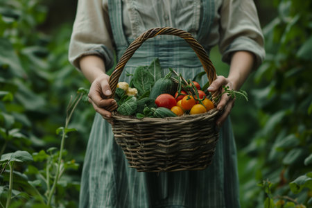 Gardener Holding a Full Basket of Freshly Harvested Vegetables in a Lush Green Field