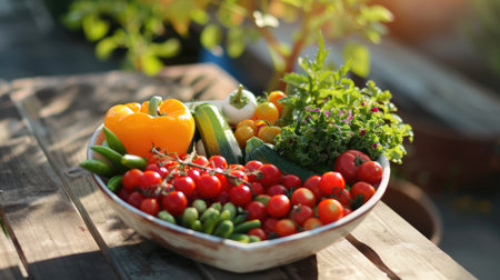 Variety of fresh vegetables in a heart-shaped bowl, featuring bell peppers, zucchini, and cherry tomatoes, on a sunny outdoor table.