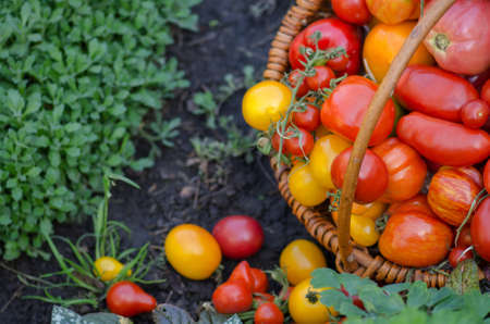 Process of harvesting tomatoes. Harvesting organic tomatoes in greenhouse. Many different tomato in summer day.
