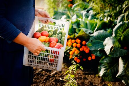 Close-up of a farmer wearing gloves holds a basket of a box with ripe vegetables: green cucumbers, red and yellow tomatoes, peppers, chili peppers. Concept harvesting in autumn, bio-farm. Blick light and sun.