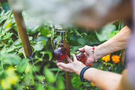 Hands of senior woman harvesting tomatoes in garden. Selective focus.