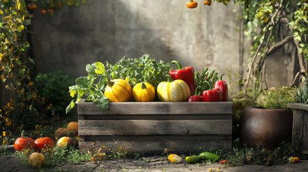 A rustic garden scene with a wooden vegetable crate filled with freshly picked vegetables like squash, peppers, and herbs, set against a garden backdrop