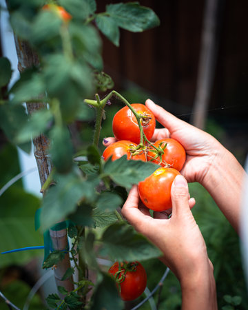 Asian lady hands picking ripe tomatoes off vines branches at backyard kitchen garden in Dallas, Texas, organic homegrown Dona heirloom French tomato plant with cage and bamboo stakes support. USA