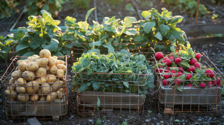 A collection of wire baskets sits on the ground of a garden. The baskets are filled with freshly harvested potatoes, leafy green vegetables, and red radishes. The sun is shining brightly, creating a warm and inviting atmosphere.