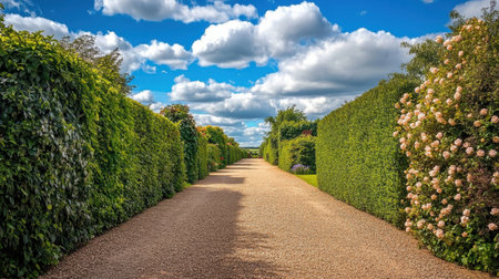 A beautifully maintained garden pathway lined with vibrant hedges and flowering plants, perfect for leisurely strolls. The captivating blue sky and fluffy clouds enhance the serene atmosphere, inviting peaceful moments in nature.