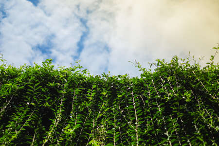 Closeup of a hedge with green leaves in summer on blue sky with clouds and copy space