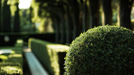 the idyllic scene of round hedges, showcasing vibrant shades of green, contemporary aesthetics to convey the tranquility and beauty of the meticulously arranged hedges