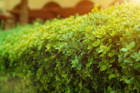 Close-up of green hedge in a sunny garden. Concept of gardening, nature, outdoor landscaping, greenery, green landscape design. Copy space.