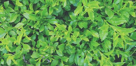 Green hedge shrub Cotoneaster Lucidus for background texture. Fresh leaves are evenly spaced on the frame. Natural green background with place for text. Selective focus.