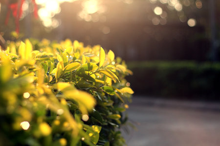 Green bush on sunset with warm sunlight. Green leaves wall. Use for background.