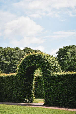 Close-up of neat garden and green bushes near German Chancellery in Berlin, Germany. Rectangular shape