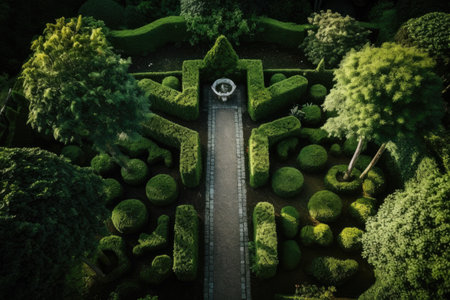 AI Generated. Winding pathway through lush green hedges in a tranquil garden setting