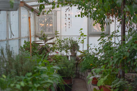 Rainy day. Home gardening blooming in green house with spring rain. Countryside, day time