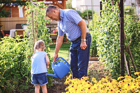Portrait of smiling mature man picking vegetable from backyard garden. Proud Caucasian man farmer harvesting vegetables.