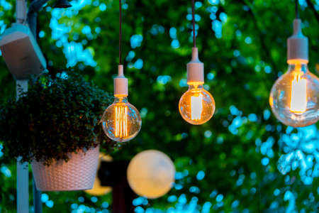 Lanterns-light bulbs on a background of green trees. Hanging lights at the festival. Street decor. Design background