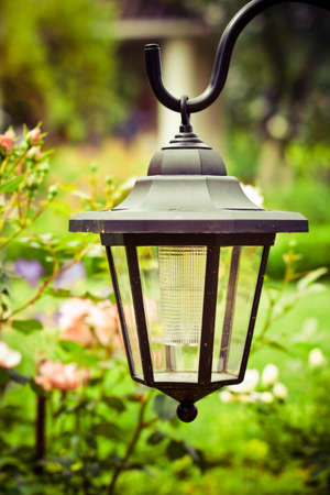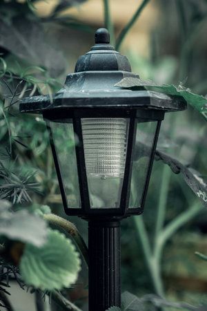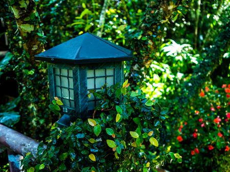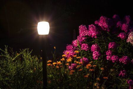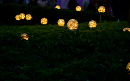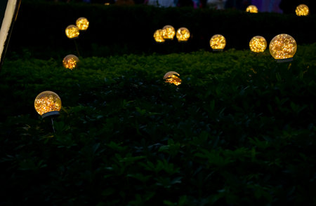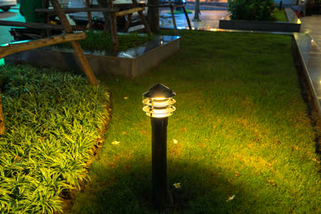 Lighting decoration in the garden at night. Glowing lamp. Copy space.