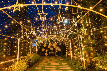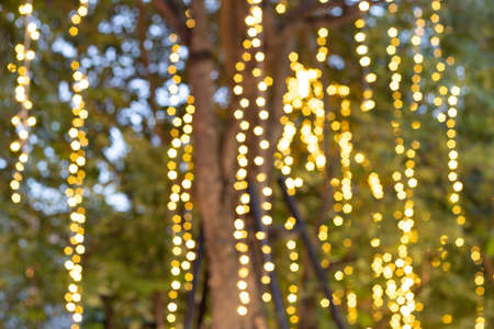 Blur bokeh Decorative night wedding outdoor in garden with string lights hanging on tree.