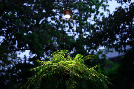 Electric bulb and hanged plant at evening time in garden. Cozy and comfortable place.