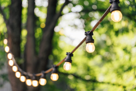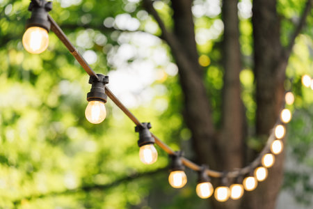 Glowing vintage style string lights hanging in garden, with soft focus on green trees and natural bokeh background. Warm and festive outdoor atmosphere, street decor.