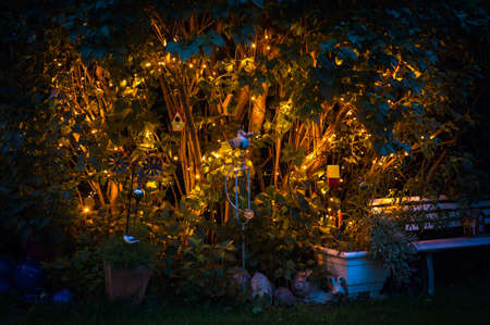 Idyllic evening scene with bushes in which many small lamps brighten the darkness in an atmospheric way.