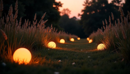 Pathway lined with illuminated spheres in residential backyard at dusk