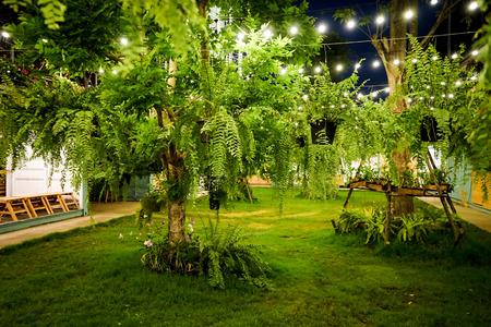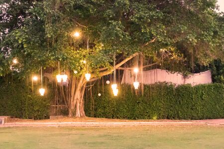 Villa garden with large magnolia tree with many lanterns and electric lights light bulbs hanging from its branches, wedding party or other celebration