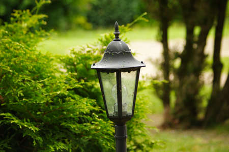 A closeup shot of a dusty street lamp in a park on a green plants backgroun
